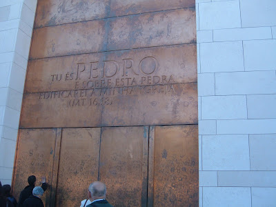 No outro dia fui visitar a nova Igreja do Espírito Santo, em Fátima. A primeira foto é de uma das 12 imponentes portas que a compõem. A segunda foto é de um dos parques de estacionamento para os 'peregrinos' que se encontram á volta do santuário. Não consigo explicar porque fiquei com uma azia ligeira, quando li umas das suas inscrições. Ora reparem lá.